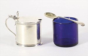 Gewürzsaliere Chester um 1947/48, Silber 925/000, sig.: S.I.Ld., cobaltblauerer Glaseinsatz, oben fein angefast Kante, gradliniges Behältnis, H = 54,0 mm, D = 45,3 mm; passend dazu ein kl. Löffel, L = 78,5 mm (teilvergoldet)