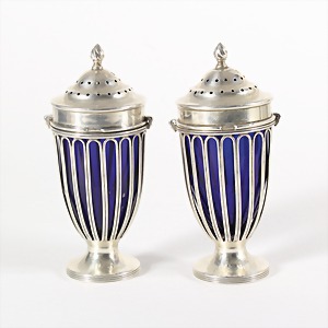 Salz u. Pfefferstreuer im "ADAM STYLE", London 1906-7, sig.: EJHNH, cobaltblauerer Glaseinsatz nach unten verjüngend, oben fein angefaste Kante, der Deckel läßt sich durch Drehen öffnen (Bajonett) , Verschlußtechnik ist harmonisch in die Gestaltung eingebunden, der feinen Drahtkorpus setzt den blauen Farbton edel in Szene ! H = 98,5 mm, D = 41,5 mm, hervorragende Silberschmiedearbeit ! sehr guter Erhaltungszustand !