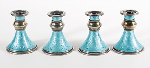 4 Kerzenleuchter um 1920/30, wohl Norwegen oder Dänemark, Silber 925/000, umlaufend transluziedes Emaille in leuchtendem Türkis, Hintergrund in unterschiedlichen Mustern guillochiert, H = 55 mm, D = 46 mm