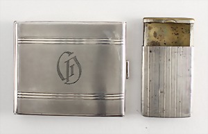 Zigarrettenetui 1940/50er Jahre, Silber 835/000, sig.: 835 KH, ca. 92 x 77 x 14,5mm, Oberfläche leicht gespannt, (1 x für lange, 1 x für kurze Zigaretten), Monog.: GD. Streichholzbehältnis, Silber 800/000, mit seitlicher Anreibefläche (Schuber: Metall), 63,5 x 43 x 11 mm