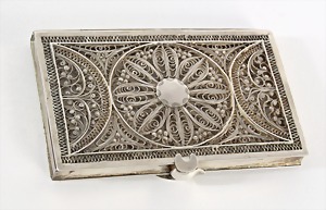 kl. Etuit in Form eines Büchleins "BREVERL", Süddeutsch, 1.Hälfte 19.Jhd., Silber, im Innern der mit feinen Drähten gestalteten Oberfläche wurden u. a. Reliquien oder ähnliches aufbewart, ca. 58,5 x 93,5 x 8,5 mm mit einer Klappe zu Schließen !