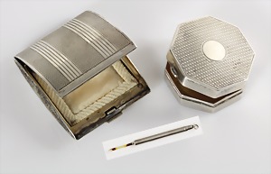 Lot: Utensilien für die Damen-Handtasche, 1. Hälfte 20.Jhd, 1 Puderdöschen, Silber 835/000 ca. 52 x 44 x 10,8mm, Oberfläche leicht gespannt; 1 Pillendöschen mit Spiegel, Sterlingsilber (innen vergoldet), sig.: "LONDON" 1926/27 HP & S, D = ca. 40 mm, beide mit Scharnierdeckel; 1 Zahnstocher mit Schildpattspitze, L = 63,5 - 87 mm