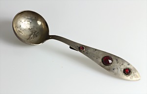 Hochzeitslöffel, wohl Friesland Anfang 19.Jhd., lötiges Silber, sig: SCHOTT, RV: Monog.: J. Schlömer mit kl. Haken zum Einhängen, 3 rote Glassteine im Rosenschliff, fein graviertes Ornament, L = 16 cm