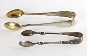 Lot: 2 Zuckerzangen, 1 Zange, Silber 800/000 sig.: L.KAEMPFF, vergoldete Laffeln, L = 13 cm; 1 Zange, "SHEFFILD" um 1893/94, den Griff zieren auf beiden Seiten ein Mönch, L = 10,6 cm