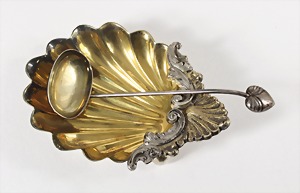Kaviarschälchen, Italien um 1900, Silber 800/000, muschelförmiges Schälchen mit blattartigen Zierelementen, Innen Feuervergoldet, 2 ausgestellte kl. Kugelfüße, stilvolles Löffelchen, Silber 800/000, am Stilende ein kl. Herz, (außen graviert: GL), Schale: 110 x 80 x 20 mm; Löffel: L = 11,5 cm, sehr schöner Zustand ! Alles total 81,1 g