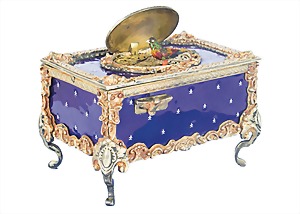 Spieluhr/Singvogelautomat, Anfang 20.Jhd., Silber 925/000, vergoldet, sig.: STERLING, Gehäuse blau emailliert mit dezentem Liliendekor, nach dem Auslösen öffnet sich das Medaillon (emaillierter Blumenstrauß), der Vogel springt heraus, wärend er singt dreht er sich von links nach rechts, öffnet dabei den Schnabel u. schlägt mit dem Schwanz u. den Flügelfedern. Nachdem der singende Vogel seine fröhliche Melodie zu Ende gepfiffen hat, kehrt er in sein Nest zurück, Maße: ca. 106 x 74,5 x H 12,5 cm, die meisten Mechaniken für Singvogelautomaten wurden von der Fa. Reuge hergestellt, guter/sehr guter Erhaltungszustand !