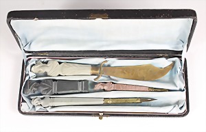 Schreibset, ITALIEN um 1880 in orig. Schatulle, Griffe aus geschnittener Lava "VESUVIO", Metall verg., die jeweiligen Enden mit Büsten verziehrt, 1 Brieföffner, 1 Petschaft, 1 Bleistift u. 1 Schreibutensil füt Tinte, L = 10 - 18,8 cm,