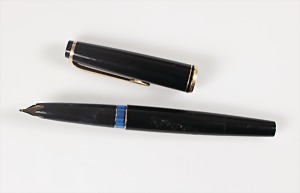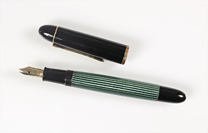 Kolbenfüllfederhalter, "PELIKAN", vergoldeter Ring u. Clip, 585 / 14 k Goldfeder, Korpus: schwarzes Edelharz mit grüne abgesetzten Streifen, L = 12,5 cm