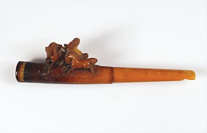 Zigarrenspitze um 1900., Bernstein "BUTTERSCOTCH", Meerschaum mit geschnitzter Pferdeszene, L = 142 mm, total 25,9 g (1 Bein mit kl. Fehlstelle)