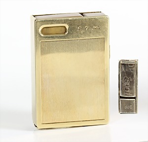 Benzin-Feuerzeug 1940/50er Jahre, GG 585/000, sig.: D.P. Esprit DRP (Deutsches Reichs Patent), seitlich mit dezenter Gravur: 9.7.57, ca. 48,3 x 32,4 x 11,5 mm