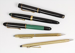 Lot: 3 Kolbenfüllfederhalter, vergoldete Ringe u. Clip, Korpus: schwarzes Edelharz, davon 1 "PELIKAN" 120 (Kappe lose !), L = 12,5 cm; 1 Drückbleistift (CROSS ?) graviert: SENATOR, L = 13,1 cm; 1 Kuli "CROSS" V 20, MADE IN IRLAND, 10KT GOLD ROLLED, L = 13,3 cm