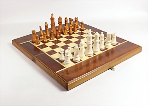 Schachspiel, Erbach aus den 1950er Jahren, Schachfiguren aus Elfenbein, Bauern H = 41 mm, Könige H = 102 mm, Elfenbeinfiguren sind hellbraun eingefärbt, Schachbrett ca. 42,5 x 39,3 cm (aufgeklappt), im geschlossenem Zustand ca. 39,3 x 21,3 x 5,5 cm, im Innern lassen sich die Figuren aufbewahren ! (1 weißer Bauer später in Kunststoff ersetzt), Schachbrett und innenliegendes Backgammon-Spiel sind verschiedenfarbig ausgelegt. Verschicken nur ins Eu Ausland !!!! Bitte beachten Sie die Einfuhrbestimmungen Ihres Landes !
