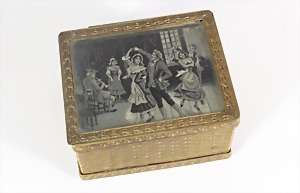 kl. Schatulle um 1920, Messing mit Resten alter Vergoldung, innen mit Holz ausgelegt, Stoffbild in feiner Gobelintechnik gewebt, ca. 10,8 x 9 x 5,7 cm, mit Scharnierdeckel