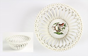 kl. Porzellanschale um 1950/60, "HEREND" (Ungarn), handbemaltes Vogelmotiv, Korpus mit Runddrähten, durchbrochen gearbeitet, D = 11,5 cm