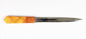 Brieföffner, ART-DECO der 1930/40er Jahre, Heft beidseitig mit Bernsteinplatten "BUTTERSCOTCH" belegt, Metall, L = 22 cm