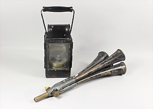 Lot: 1 Bahnlampe mit Henkel, Mitte 20.Jhd., schwarze Emaillefarbe, H = 21,5 cm (ohne Henkel); 1 Signalhorn DB 80, "MARTIN SIGNAL" 4-Klang L = 41 cm, gut gebraucht !