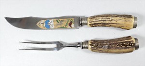 Jagdbesteck, "GEBRÜDER BECKER" Solingen, 1 Messer mit Jagdszene, geätzt u. bemalt, L = 32,8 cm; 1 Gabel, L = 28,8 cm, mit kräftigen Geweihgriffen