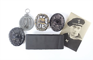 Lot: 4 Stck. Verwundeten Orden 1. u. 2. Weltkrieg, 1 Kriegsmarineband u. Träger (als Foto), u. a. 1 x Verwundetenorden durchbrochen; 1 x Normal; 1 x Winterschlacht im Osten 1941/42, 1 x für ein- u. zweimalige Verwundung, Nr 81 (sehr gut erhalten)