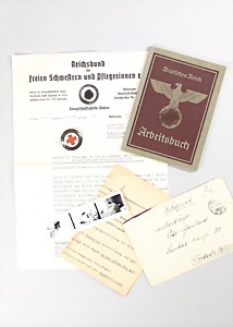Lot: 1 Orden, Deutsches Rotes Kreuz "Helferin", 1 Deutsches Reich Arbeitsbuch, 1 Brief zur Aufnahme in den Reichsbund der Freien Schwestern u. Pflegerinnen; 1 Feldpostbrief; Schreiben des Vaters zur Aufnahme; 1 Bild dr Schwester Gertrud mit Orden