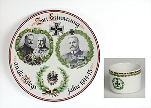 Lot: Teller 1. Weltkrieg, "Zur Erinnerung an die Jahre 1914-15, Kaiser Wilhelm und Hindenburg, farbig bemalt, D = 25 cm; 1 Tasse, 1. Weltkrieg 1914, D = 7,5 cm