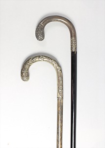 Lot: 2 Spazierstöcke, "JUGENDSTIL" um 1900, Griffe aus Neusilber, sig: NICKEL SILVER, 1 Stockgriff mit klassischen, floralen Motiven (Libellen u. Schmetterlingen) verziert; 1 Stockgriff Oberfläche mit kl. Hügeln verziert, L = ,89 u. 90 cm