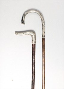 Lot: 1 Spazierstock u. 1 Reitgerte, "JUGENDSTIL" um 1900/10, 1 Stock, Griff aus Silber 800/000, feine geschwungene Linien zieren den zarten Stock, gemasertes Holz, L = 90 cm; 1 Reitgerte, Griff aus Silber 800/000 sig: Einhorn (Schwäbisch Gmünd), leicht vertiefte, reduzierte Linien, L = 78,5 cm