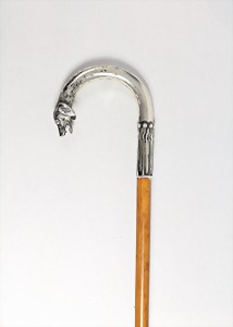 Spazierstock, "JUGENDSTIL" um 1900, Grif aus Silber 800/000, sig.: 800 Hufeisen (Symbol), das Ende des Griffes ziert ein vollplastischer Windhundkopf, am Ansatz feine Linien mit kl. Kugeln an den Enden (teilw. Eingedrückt), Holz mit farblichen Fehlstellen, L = 91 cm