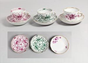 3 feine Moccatassen für ein petit caffeé, MEISSEN Anfang 20.Jhd., verschiedenfarbiges Blumendekor, Golstaffage u. Goldränder, Tasse D = 6,6 cm, Untertasse, D = 10,8 cm, sehr gut erhalten !