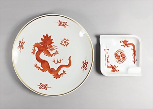 Lot: Porzellan, "Roter Ming Drache, reich", MEISSEN, Mitte 20.Jhd., 1 Teller D = 25,5 cm mit Goldrand (Wandteller); 1 Aschenbecher ca. 13 x 13 cm
