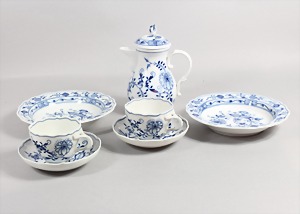 Kaffeégedeck, MEISSEN, Mitte 20.Jhd., 2 Kuchenteller (II. Wahl), D = 18 cm; 2 Tassen, D = 8 cm, mit Untertassen, D = 12,8 cm; 1 Kännchen (II. Wahl), H = 17 cm, blaues Zwiebelmuster unter Glasur, gut erhalten !