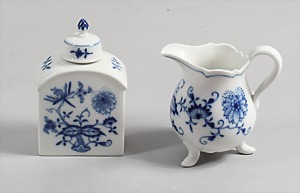 Zuckerdose u. Milchkännchen, MEISSEN, Mitte 20.Jhd., blaues Zwiebelmuster unter Glasur, H = 8,5 u. 9,5 cm, gut erhalten !