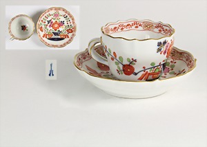 Kaffeegedeck, MEISSEN, "INDISCHE BLUME" 2.Hälfte 19.Jhd., feine polychrome Bemalung, Knaufsche Schwerter, Tasse D = 6,3 cm, H = 5 cm , Untertasse D = 10,5 cm, sehr guter Erhaltungszustand