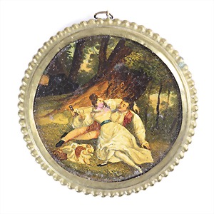 Miniaturmalerei um 1850., freizügige Picknikszene unter einem Baum, Öl auf Holz, Messingrahmen, D = 88 mm, (Deckel einer alten Tabatiere)