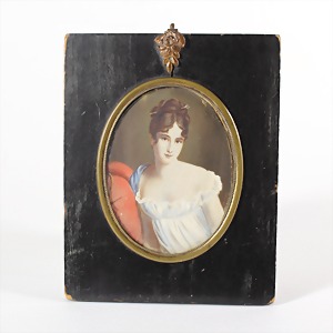 Bildnis der "ALMA RÉCAMIER" nach dem Gemälde Francoir Gérard (1770-1837), Paris, Louvre, handcolloriertes Bild, Anfang 20.Jhd., sig: Vauron, Rahmen um 1820/40, ca.13,5 x 11 cm