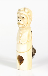Zigarrenabschneider 1.Hälfte 20.Jhd., Bein/Elfenbein, ein Hundegesicht schaut aus einem Kapuzenumhang, H = 60 mm, D = ca. 15 mm