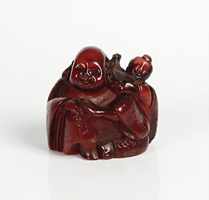 Netsuke, geschnitzte Figur aus braunem Kunststoff, Japan 1930er Jahre, feine gravierte Linien, H = 28,5 mm, total 12,4 g