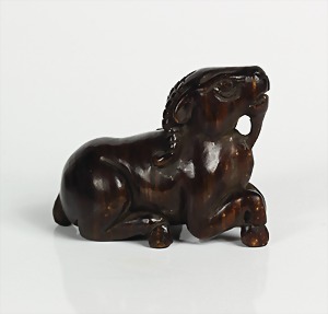 Netsuke, geschnitzter "BÜFFEL", Japan um 1900 (Meiji), tropisches Holz (Palisander ?), H = 27,3mm, L = 47,5 mm