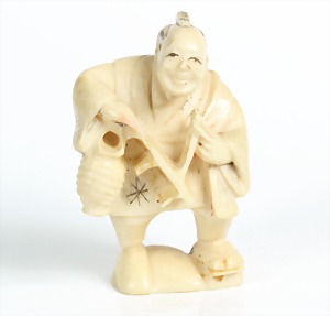 Netsuke, geschnitzte Elfenbeinfigur, Japan um 1920, feine Linien teilweise schwarz hinterlegt, H = 51 mm, total 26,1 g