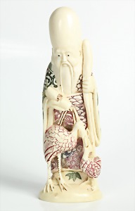 Elfenbeinfigur, Japan Anfang/Mitte 20.Jhd., "HEILIGER" mit Stock, zu Füßen ein Vogel, der sein Junges mit einem Fisch füttert, Oberfläche aufwändig beschnitzt u. bemalt, H = 10,0 cm