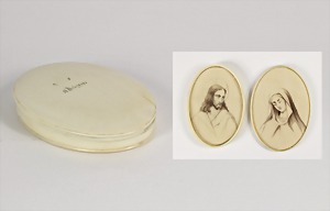 Elfenbeindose um 1900, innen mit christlichen Motiven, ca. 90 x 63 mm, Deckel leicht gespannt !