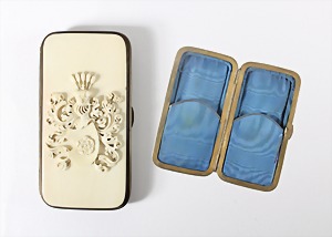 Zigarilloetui um 1880, die Vorderseite ziert ein aufwändig geschnitztes Wappen in Elfenbein, Helm u. Helmzier sehr fein gearbeitet, die Rückseite ist komplett mit Elfenbein belegt, Innen 2 Fächer (mit Stoff ausgeschlagen), 14,2 x 7,3 x 25,5 mm, über Scharnier zu Öffnen ! Verschicken nur ins Eu Ausland !!!! Bitte beachten Sie die Einfuhrbestimmungen Ihres Landes !