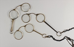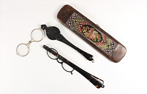Lot: Frankreich Ende 19.Jhd., 1 Longion mit Schildpattgriff und Federmechanik, L = 19 cm; 1 Stabbrille zum Ausklappen (mit alter Rep. Stelle) mit Originalschuber, L = 22,5 cm; 1 besticktes Brillenetui L = 23 cm