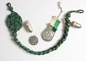 Lot: 1 Patronenhülse 2. Weltkrieg: K.K.S. 1937; 1 Patronenhülse 2. Weltkrieg: K.K.S. 1938 an grünem Band; 1 Medaille Silber 800/000, Schützenkönig 1941/42 F.Z.ST. GAU XIV BADEN H.KALLEN, D = 28,5 mm; 1 Schützenorden: 09 M`HM 1.V.M.1941 W.Z.ST.A.H. an Stoffband
