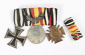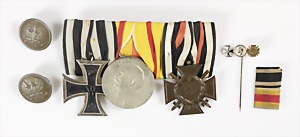 3-teilige Ordensspange, 1.Weltkrieg, 1 x Eisernes Kreuz 1914/1913; 1 x Eisernes Kreuz 1914 / 1918; 1 x FRIEDRICH II GROSSHERZOG VON BADEN gute Erhaltung !; 1 kl. Nadel (gleiche Abzeichen); 2 Knöpfe (Kaiser Wilhelm)