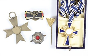 Orden/Abzeichen: 1 Mutterkreuz der 2. Stufe, 2. Form 1938, gute Erhaltung, in Originalschatulle; 1 Nadel mit Adler, L = 15,2 mm, 1 Eisernes Kreuz 1939; 2 Beigaben !
