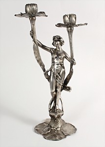 Kerzenleuchter, Prager "JUGENDSTIL" um 1900, sig.: A.W. A. & P (Punzen teilweise überschlagen), Metallguss, tanzende Nymphe zwischen zum Himmel steigende Seerosen, zu ihren Füßen Seerosenblätter, sehr fein gearbeiteter zweiarmiger Leuchter, H = 33,5 cm