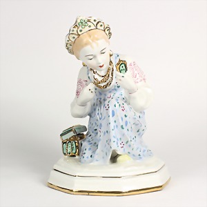 Porzellanfigur, 1.Hälfte 20.Jhd, Mädchen mit Schmuckschatulle u. Spiegel, nordisch/russisch ? bunte Malerei, getreppter 8-eckiger Sockel mit Goldrändern, D = ca. 15 cm, H = 20 cm, restauriert, Kopf geklebt, Kette mit Fehlstellen !