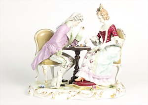 Figurengruppe, Thüringen 1. Hälfte 20 Jhd., Schachspielendes Pärchen zu Füßen eine Katze, bunte Malerei, Rocaillensockel (oval) mit Goldstaffage, Blüten, Blätter u. Schachspiel bestoßen (mit Fehlstellen), Sockel ca. 20,2 x 14,3 cm, H = 18 cm