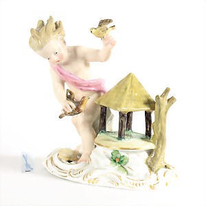 Porzellanfigur "DER WIND", MEISSEN 2. Hälfte 19.Jhd., Amorette steht neben einem Vogelhäuschen, zwei Vögel in den Händen haltend, zu Füßen ein Blasebalg, aus der Serie der Vier Elemente, Modell von Johann Kaendeler um 1770. Porzellaan weiß glasiert u. polychrom bemalt. Rocaillensockel mit Goldstaffage, eingeritzte Modell Nr. 660, H = 13 cm
