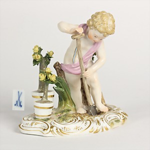 Gärtnerkind "DIE ERDE", MEISSEN 2. Hälfte 19. Jhd., Amorette mit Spaten, Rechen und zwei Töpfe mit Rosenstöcke, aus der Serie der vier Elemente, hier die Erde. Entwurf von Johann Kaendeler um 1770, Porzellan weiß glasiert u. polychrom bemalt. Rocaillensockel mit Goldstaffage, eingeritzte Modell Nr. 100, H = 11 cm